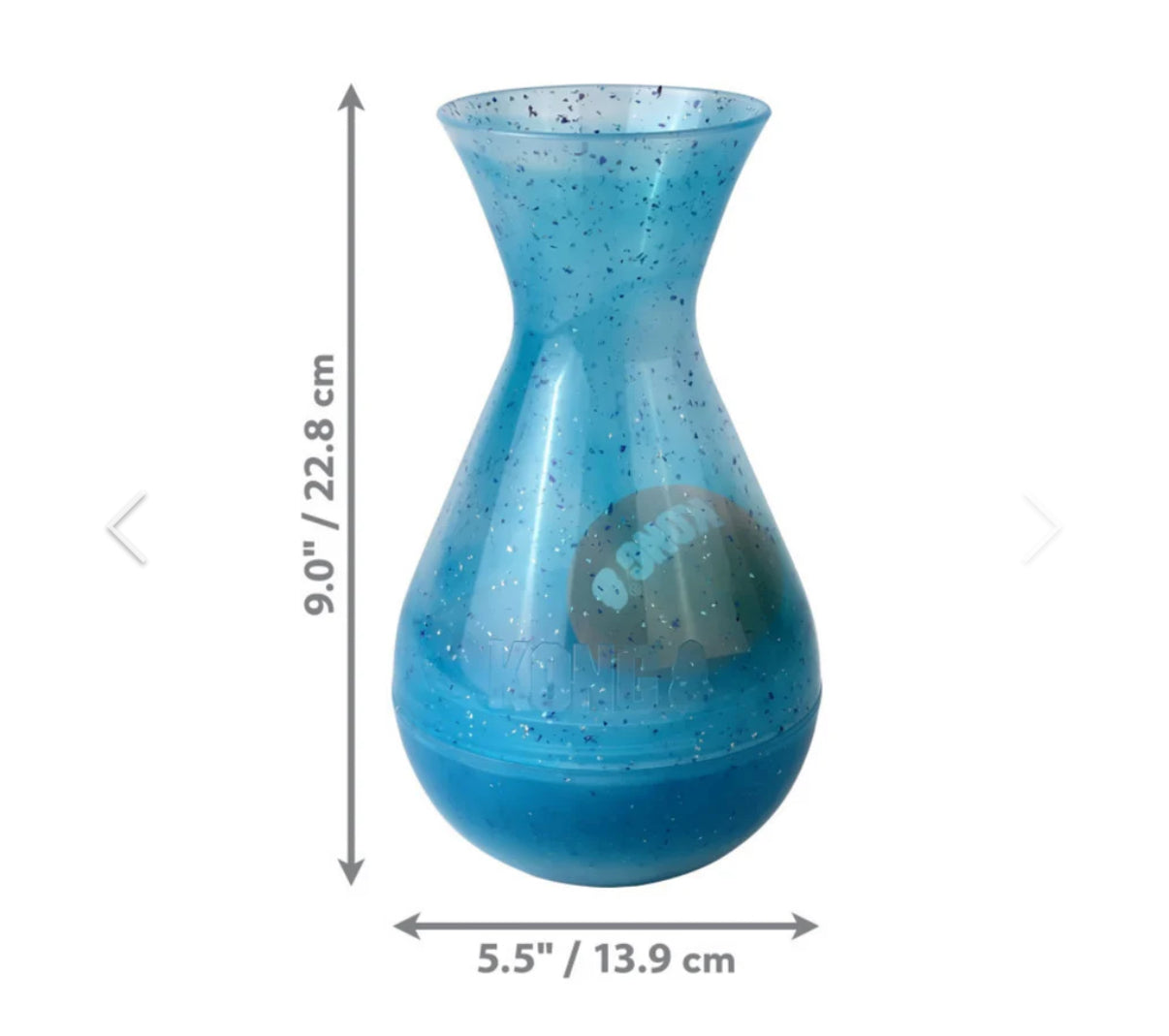 KONG Rewards Tipsy is an action-packed and mentally stimulating food or treat dispenser for curious dogs who need an extra challenge and slower feeding. This wobbling toy sits upright, with a ball in the open upper half to slow down fast eaters and provide added challenges, while the lower half is weighted to encourage the wobbling action as dogs knock the toy around with their nose or paws. The ball can be removed for easier reward and encouragement, then replaced to increase the challenge. The KONG Rewards Tipsy is also ideal for weight loss, giving dogs exercise while they work to eat their food. The unpredictable movement stimulates natural foraging instincts, keeping even the most seasoned dogs challenged. Ideal for indoor enrichment. Top unscrews for easy cleaning.